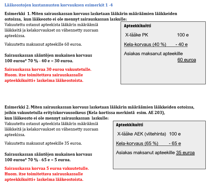 👉 toimita em. "Laskelma lääkeostosta" sekä kassakuitti sairauskassalle (hakuaika 6 kk).